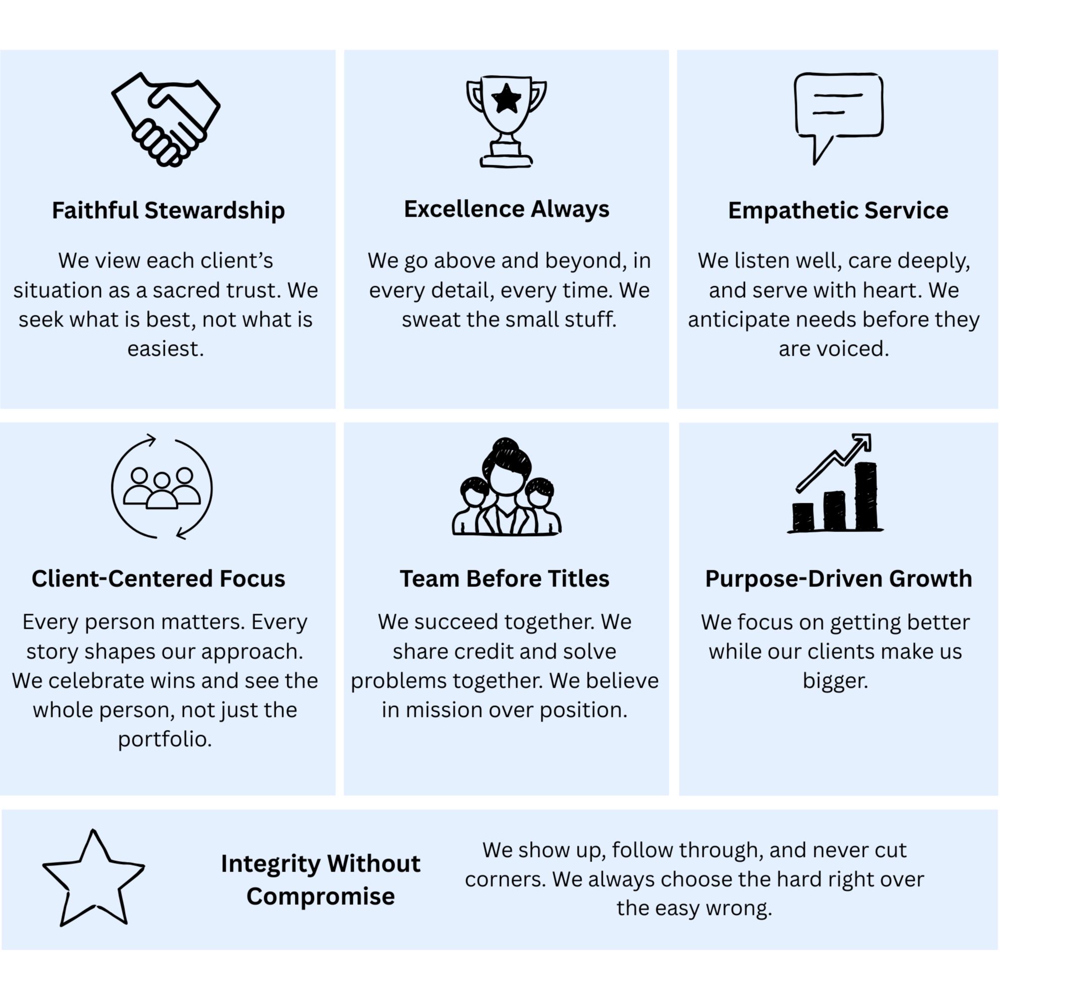 As a team, we hold ourselves to the highest standards of integrity, excellence, and care. We believe true success is measured not only by results, but by the flourishing of our clients and our people. Together, we are more than wealth managers — we are trusted partners, stewards of legacy, and builders of something that lasts.